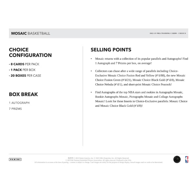 Get ready for an unparalleled collecting experience with the 2022/23 Panini Mosaic Basketball Choice Case! This edition is packed with the dynamic energy of the NBA, featuring a stunning array of base cards, vibrant parallels, and exclusive inserts. Don’t miss your chance to own a piece of the action—grab your 2022/23 Panini Mosaic Basketball Choice Case today and take your collection to the next level!