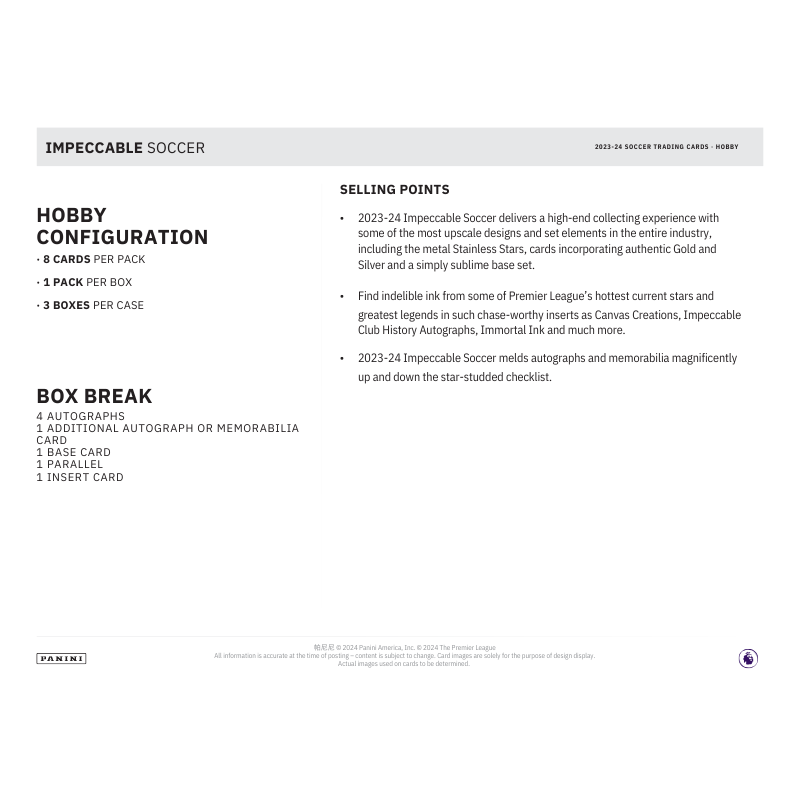 – 2023-24 Impeccable Soccer delivers a high-end collecting experience with some of the most upscale designs and set elements in the entire industry, including the metal Stainless Stars, cards incorporating authentic Gold and Silver and a simply sublime base set.