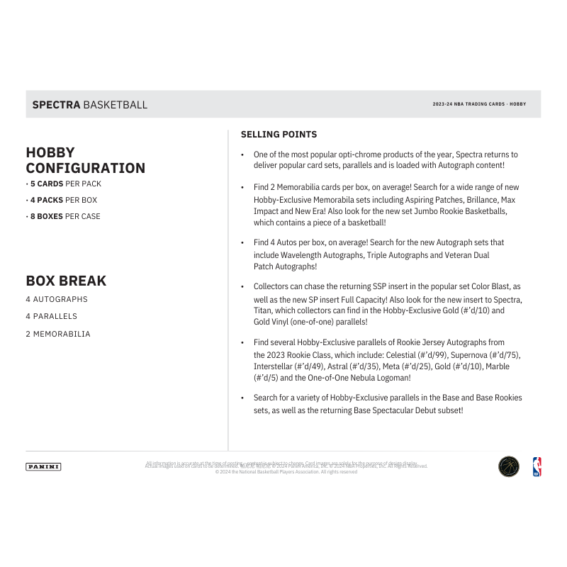 Unveil a world of radiant design and unparalleled basketball excitement with the 2023/24 Panini Spectra Basketball Hobby Box. This premium collection is a must-have for any basketball enthusiast, featuring stunning card technology that captures the essence of the sport’s brightest stars and legendary icons. Elevate your basketball card collection with Spectra’s cutting-edge artistry and discover why it remains a favorite among collectors.