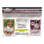 The 2023 Topps Chrome Baseball Hobby Box is back and better than ever, where you’ll discover endless dazzling chrome cards showcasing your favorite MLB stars. Prepare for heart-pounding pulls, rare refractors, and amazing autographs as you embark on an unforgettably fun collecting journey!