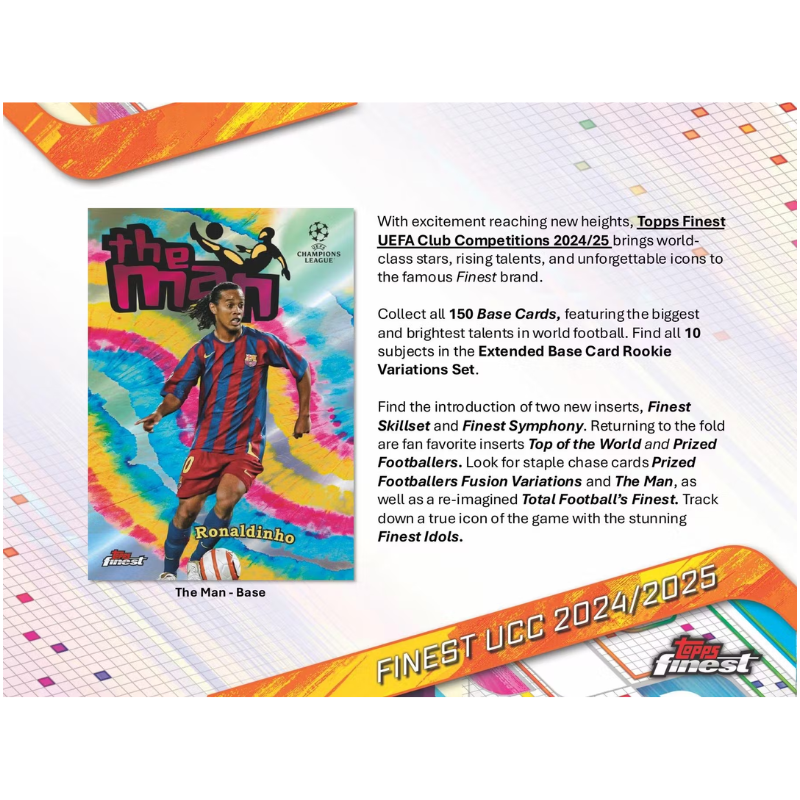 Collect the brand-new inserts Finest Skillset, highlighting the top young talents, and Finest Symphony, featuring a lineup of silky stars. Look for Top of the World and Prized Footballers, as well as key chase cards Prized Footballers Fusion Variations and The Man. Bring your hits to the digital world with Total Football’s Finest, and keep your eyes peeled for Finest Idols.