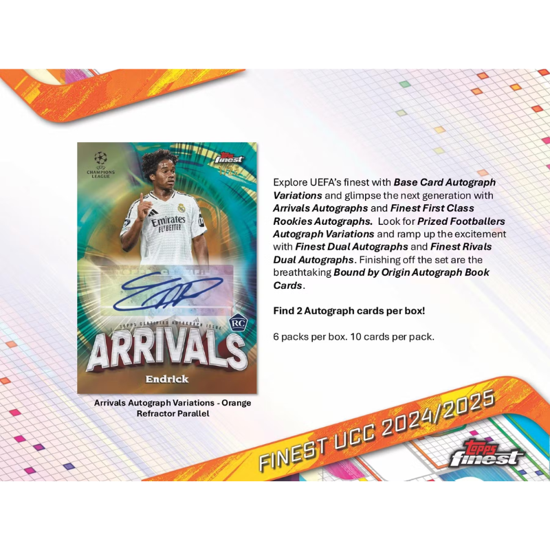 Uncover two Autograph Cards in each box, featuring superstars, rookies & legends. Look for the finest UEFA has to offer in Base Card Autograph Variations. Find the keys to the future with Arrivals Autographs and Finest First Class Rookies Autographs. We’re continuing the tradition with Prized Footballers Autograph Variations and doubling down with Finest Dual Autographs and Finest Rivals Dual Autographs. The breathtaking Bound by Origin Auto Book Cards round out the set in style.