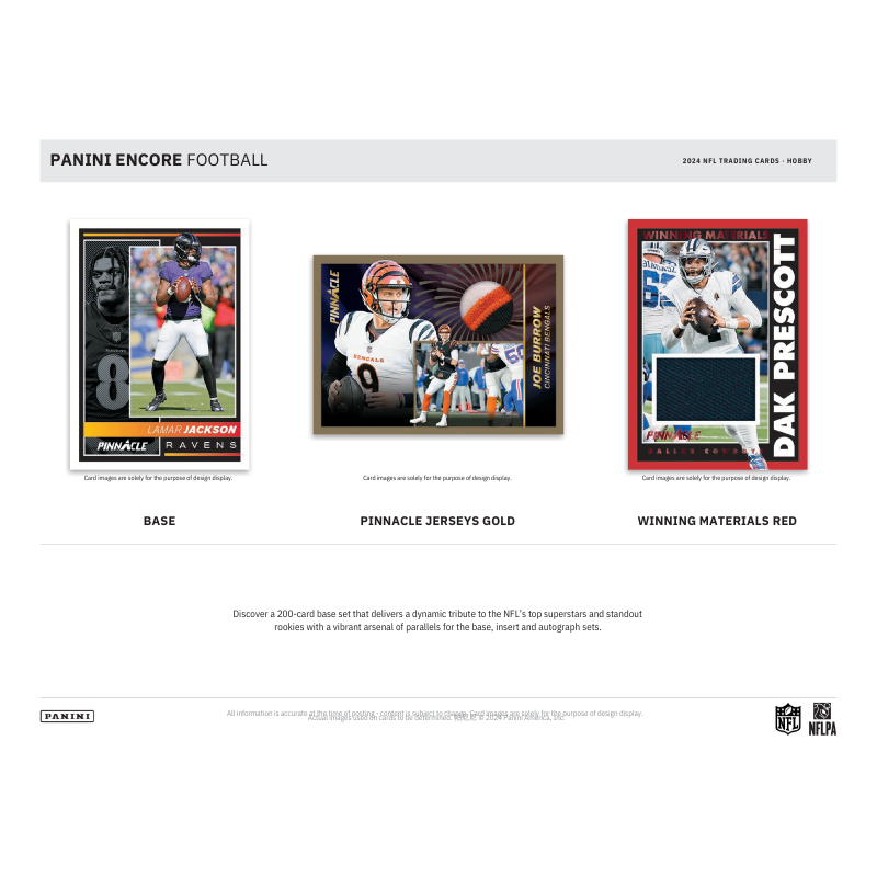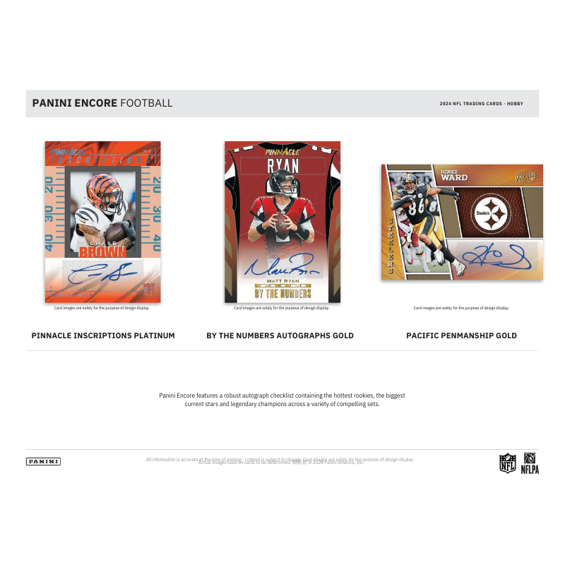 – Panini Encore Football debuts with an exciting lineup of inserts, including Pinnacle Showcase, Panini Choice and 2024 Rookies!