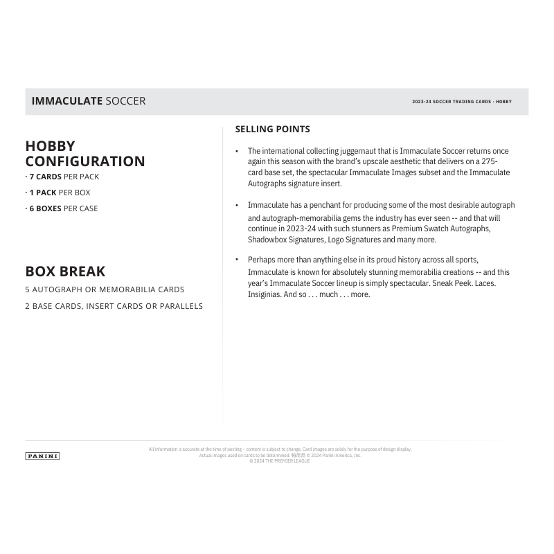 The 2024 Panini Immaculate Soccer Hobby Case is the ultimate choice for soccer card enthusiasts, offering a premium collecting experience that highlights the world’s greatest players across club and international competitions. This highly anticipated release features six cards per box, with an impressive lineup of five autograph or memorabilia cards guaranteed in every box.