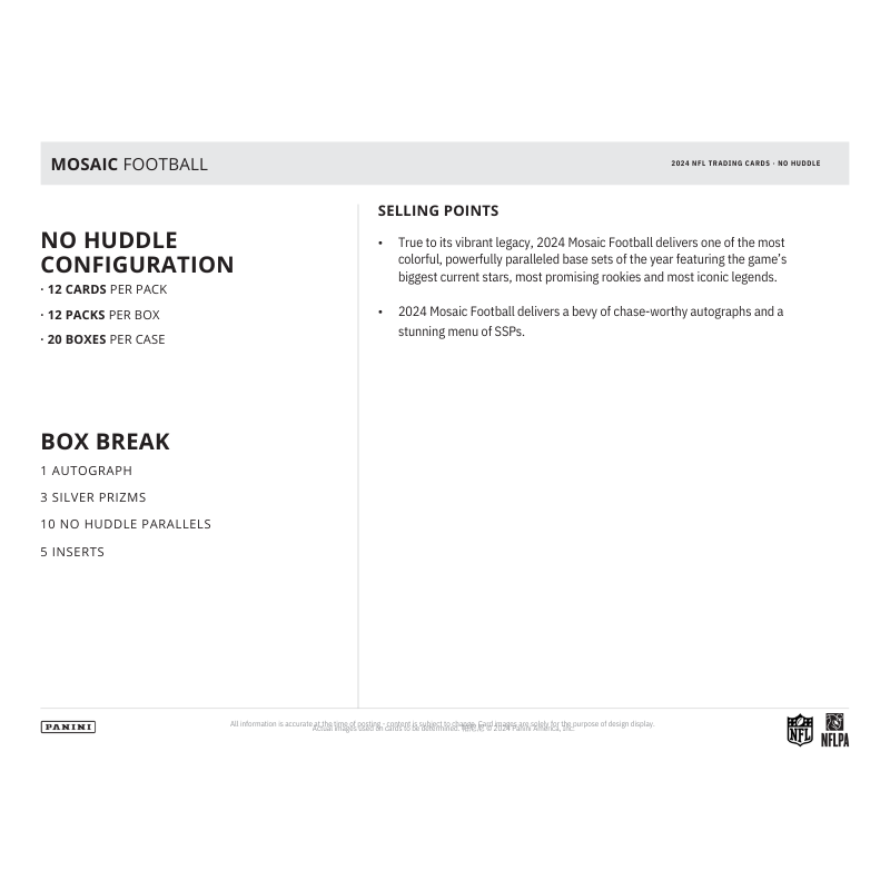 – True to its vibrant legacy, 2024 Mosaic Football delivers one of the most colorful, powerfully paralleled base sets of the year, featuring the game’s biggest current stars, most promising rookies and most iconic legends.
