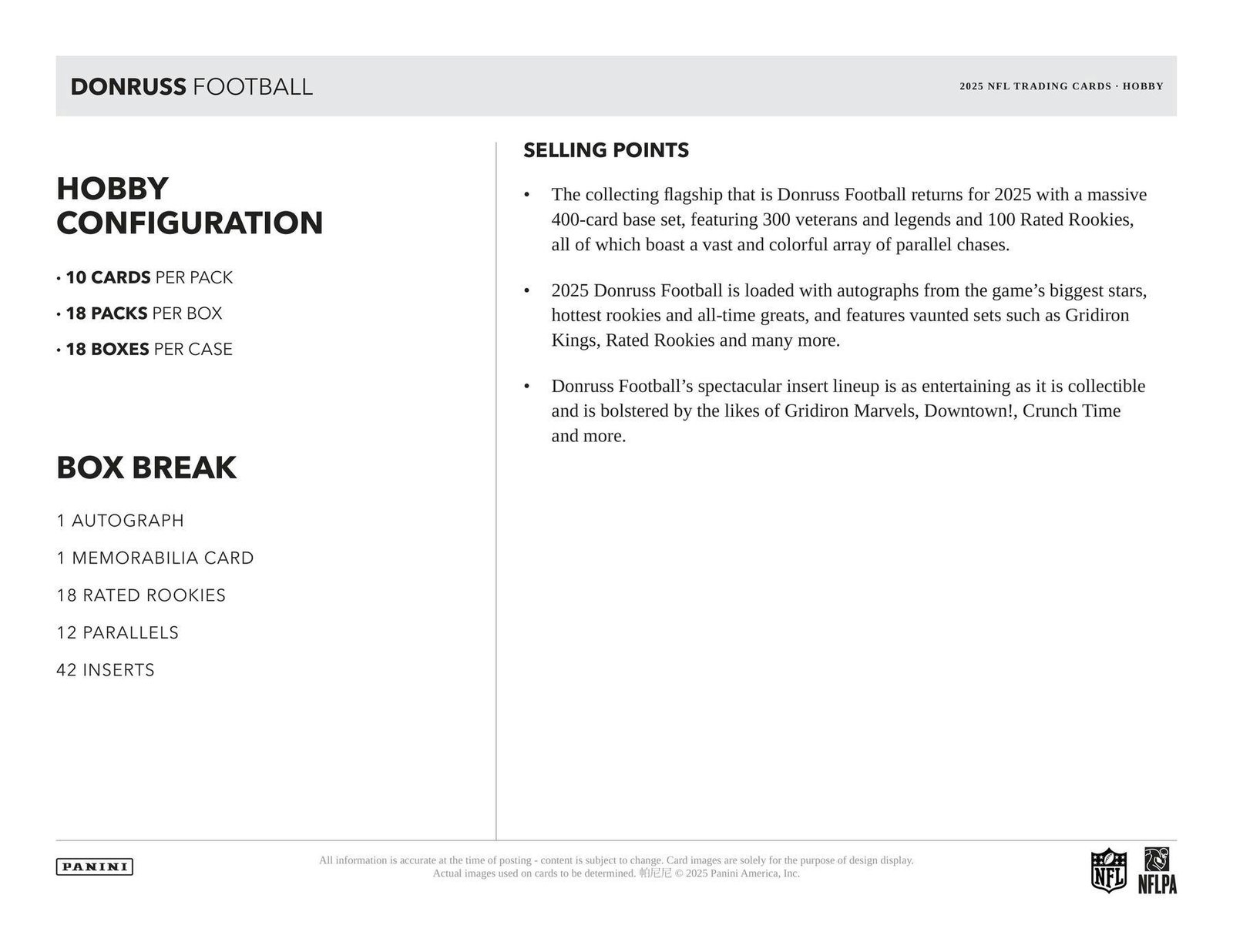 The collecting flagship that is Donruss Football returns for 2025 with a massive 400-card base set, featuring 300 veterans and legends and 100 Rated Rookies, all of which boast a vast and colorful array of parallel chases.