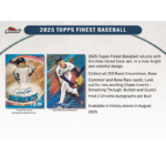 The 2025 Topps Finest Baseball Hobby Box revives its iconic chromium finish with a modern twist, featuring a three-tiered 300-card base set (Common, Uncommon, Rare) that adds an extra layer of chase appeal. Each box includes six packs of ten cards, delivering two chrome autographs, six Uncommon base cards, two Rare base cards, two base refractors, ten additional base parallels, and ten inserts or insert parallels. The insert lineup includes staples like Arrivals, Creators, Debut, Finest Timelines, and notable new themes such as Smashing Through, Bullish, and Gusto. A wide spectrum of refractor parallels—ranging from Magenta and Sky Blue to Gold, Black, Red Lava, and elusive SuperFractors—offer a spectrum of scarcity across tiers.