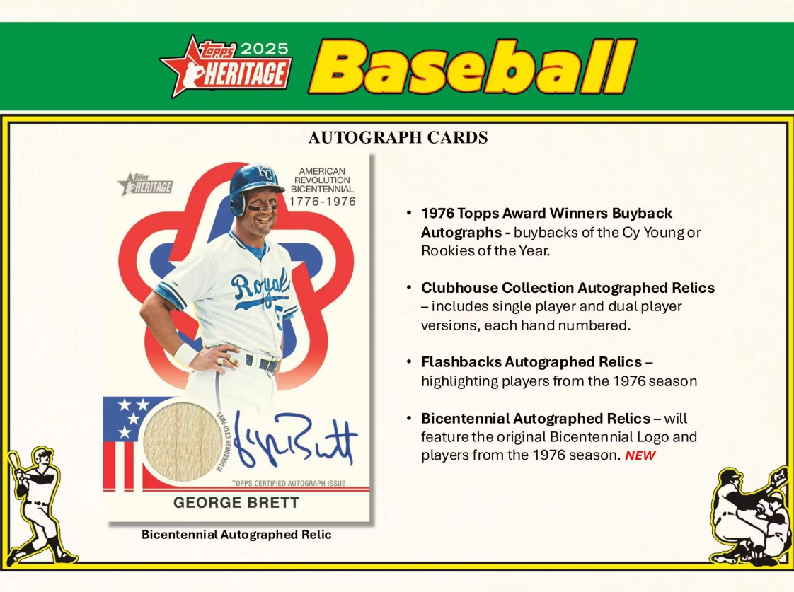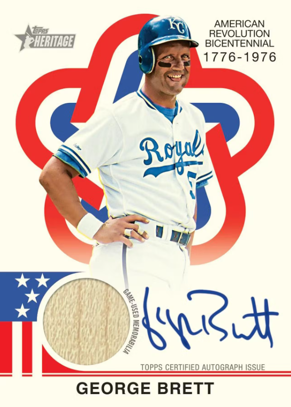 Topps Heritage is back and this year we will celebrate the 1976 design. This year we celebrate the designs, subsets and the American Bicentennial! Look for new Notable Americans, new base parallels, new chrome base parallels, new inserts, new base variations, new autographs and relics!